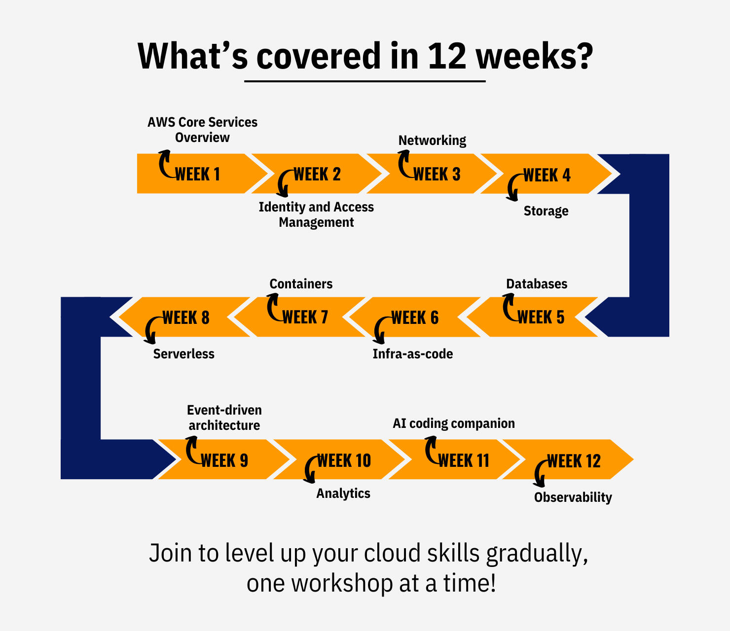 It’s a collection of self-paced workshops developed by experts at AWS and is curated to help you to gain expertise in AWS gradually.These workshops range from beginner-level to advanced, and the best part is that you can follow them at your own pace, whenever it suits you.By spending just 2-6 hours every week, you'll gain practical skills, techniques, and concepts that you can use to solve business problems and strengthen your resume to showcase your cloud skills.